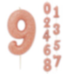 Stijlvolle taartkaars om je taart of gebakjes mee te decoreren. De taartkaars is wit en bedekt met roségoud glinsterende glitter. Combineer naar wens, want de kaarsen zijn verkrijgbaar in de cijfers 0-9.