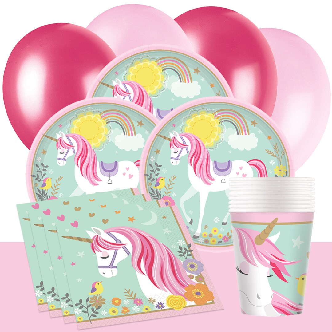 Maak van elke verjaardag een sprookjesachtig feest met onze betoverende eenhoorn versiering! Met bordjes, bekers, servetten, ballonnen, slingers en tafelkleden in pastelkleuren creëer je een magische sfeer waarin kinderen zich helemaal onderdompelen in de wereld van eenhoorns.