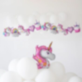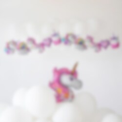 Mooie ballonslinger met verschillende eenhoornballonnen, perfect voor een kinderfeestje met een eenhoornthema! De slinger is 206 cm lang en elke ballon is 34 cm hoog. De ballonnen hebben een zelfsluitend ventiel, en je kunt ze gemakkelijk opblazen met een ballonpomp of het meegeleverde rietje.