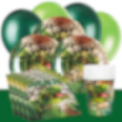 Ook inbegrepen zijn 10 lichtgroene en 10 donkergroene ballonnen die zorgen voor een avontuurlijke sfeer, samen met een donkergroen tafelkleed van plastic (137 x 274 cm).