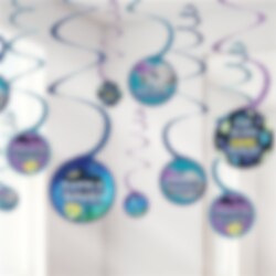 Hangende decoraties met afbeeldingen die verwijzen naar het populaire videogame Fortnite. Een coole decoratie om de feestzaal mee te versieren voor een Fortnite kinderfeestje.