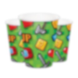 8 groene papieren bekers met afbeeldingen van verschillende videogame-iconen. De bekers zijn ongeveer 10 cm hoog en hebben een inhoud van ongeveer 266 ml.