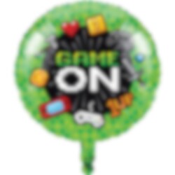 Fancy folieballon in groen en zwart. De ballon heeft stijlvolle videogame-afbeeldingen en in het midden de tekst "Game on". Een leuke decoratie voor het videogame themafeestje. Opgeblazen heeft de ballon een diameter van ongeveer 45 cm. Kan worden opgeblazen met lucht of helium.