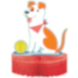 Tafeldecoratie van rode honeycomb met een afbeelding van een hond en zijn bal. Perfect om de tafel te versieren tijdens een kinderfeestje met een hondenthema. De tafeldecoratie is ongeveer 23 x 30 cm groot.