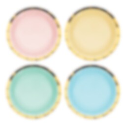 8 bordjes in 4 verschillende kleuren; pastelgroen, pastelroze, pastelgeel en pastelblauw en met goudfolie randen uit het coole Ice Cream Party thema. Leuk om neer te zetten voor elk kinderfeestje of feestje. De bordjes zijn ongeveer 18 cm in doorsnee.