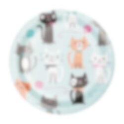 8 bordjes met een vrolijk ontwerp van verschillende katten op een mintgroene achtergrond. De bordjes hebben een doorsnede van ongeveer 18 cm.