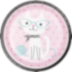 8 papieren bordjes met een roze achtergrond en zwarte randen. De bordjes zijn versierd met een afbeelding van een stijlvolle kat met een bril. Ze hebben een doorsnede van ongeveer 22 cm.