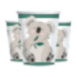 8 papieren bekers in wit en groen met een schattige afbeelding van een koala. Dek de tafel met bijpassende accessoires voor het koala- of dierenfeestje. De bekers zijn ongeveer 10 cm hoog en hebben een inhoud van 250 ml.