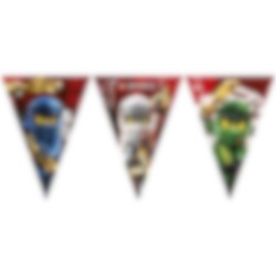 Stoere vlaggenlijn in mooie kleuren met afbeeldingen van de ninja's uit LEGO Ninjago. Hang deze boven de tafel in de feestzaal voor een leuk effect tijdens het LEGO Ninjago-kinderfeestje. De vlaggenlijn is gemaakt van papier en is ongeveer 2,3 meter lang.