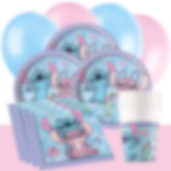 Breng een vrolijke en speelse sfeer naar het kinderfeestje met dit kleurrijke Stitch & Angel-feestpakket! Alles past perfect bij elkaar en zorgt voor een zachte, dromerige uitstraling. De borden, papieren bekers en servetten zijn versierd met schattige afbeeldingen van Stitch en Angel, terwijl de bijpassende ballonnen en het roze plastic tafelkleed de feesttafel helemaal afmaken.