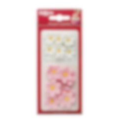 14 gedetailleerde suikerdecoraties in een mix van roze en witte bloemetjes met een gele kern – perfect voor elegante decoraties op cupcakes, taarten en ander gebak.