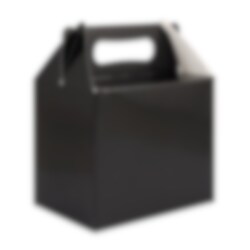 Zwarte feestbox met een handvat dat gemakkelijk opvouwbaar is. Perfect om snoepjes en verrassingen in te stoppen voor het kinderfeestje of feestje. De box is gemaakt van karton en is ongeveer 15 cm lang, 10 cm breed en 12 cm hoog. De feestboxen worden per stuk verkocht.