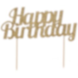 Taartdecoratie met de tekst "Happy Birthday" in een sprankelende gouden kleur. Versier de taart hiermee als er een verjaardagsfeestje is om de taart extra chique te maken. De decoratie is ongeveer 10 x 14 cm groot.