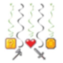 5 hangende decoraties in kartonnen en folieschroeven met leuke videogame-afbeeldingen. Een leuke decoratie om naar het kinderfeestje te brengen met een videogame-thema. 3 stuks decoraties zijn ongeveer 72 cm lang en 2 zijn ongeveer 99 cm lang.