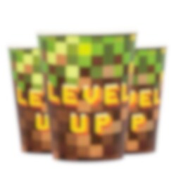 Set van 8 papieren bekers met een stoer pixelontwerp en de tekst “Level Up”. Perfect voor ranja of frisdrank tijdens een kinderfeestje in Minecraft-thema. De bekers zijn ca. 10 cm hoog en hebben een inhoud van 250 ml.