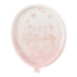 8 ballonvormige papieren bordjes in een roze ombre en met motieven van stippen en de tekst "Happy Birthday" in roségouden folie. Prachtig om voor het kinderfeestje klaar te zetten. De bordjes komen uit de Mix it Up collectie en zijn ongeveer 23 cm in diameter.