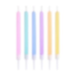 Deze taartkaarsen in mooie metallic pastelkleuren is de perfecte toevoeging aan elke feestelijke taart. Elke verpakking bevat 6 taartkaarsen met een hoogte van 12,5 cm en er zijn ook 6 stuk houders inbegrepen voor eenvoudig gebruik.