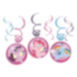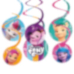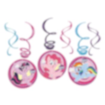 Hangende decoraties met afbeeldingen van My Little Pony. Leuk om de feestzaal mee te versieren. De decoraties zijn ongeveer 60 cm groot.