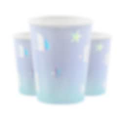 6 papieren bekers in de kleuren blauw en paars met zilverfolie zeemotieven. Leuk om toe te voegen aan de tafelaankleding met zeethema. De bekers zijn ongeveer 9 cm hoog en hebben een inhoud van ongeveer 220 ml.