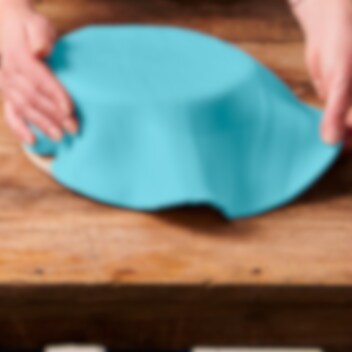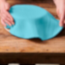 Bereidingswijze: haal de schijf uit de verpakking en rol deze voorzichtig uit. Trek aan beide randen van de witte folie om deze plat te maken. Bedek de cake met een dun laagje botercrème. Plaats de fondantschijf, met de witte folie naar boven, voorzichtig over de cake. Verwijder de folie en strijk de fondant voorzichtig glad op de taart. Snij het overtollige fondant eraf en versier de taart.