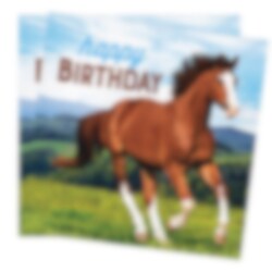 16 servetten met een leuk paardenmotief en met de tekst "Happy Birthday" in blauw en bruin. De servetten hebben 2 lagen en zijn uitgevouwen 33 x 33 cm.