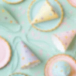 6 waanzinnig mooie feesthoedjes in schattige pastelkleuren met goudfolie randen en met motieven van sterren en linten in fijne kleuren. Een leuk detail om te hebben bij de tafelaankleding voor elk kinderfeestje of feestje.