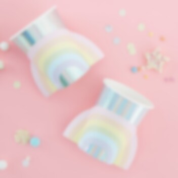 8 exclusieve papieren bekers in glinsterend parelmoer zilver met een pastel regenboog. Een indrukwekkend accessoire voor je feestje. De bekers zijn ongeveer 10 cm hoog en hebben een inhoud van ongeveer 270 ml.