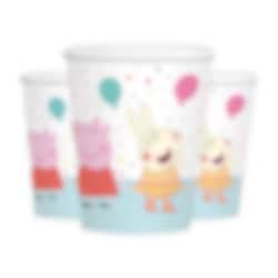 8 papieren bekers in mooie kleuren en met motieven van Peppa Pig en haar lieve vriendjes uit het populaire kinderprogramma. De bekers zijn ongeveer 9 cm hoog en hebben een inhoud van ongeveer 250 ml.