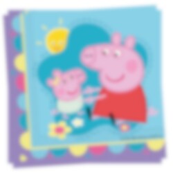 20 servetten met een heerlijke afbeelding van Peppa Pig en een klein varkentje tegen een turquoise achtergrond met zonneschijn en bloemen. Perfect om een samenhangend en vrolijk gedekte tafel te creëren voor het kinderfeestje met Peppa Pig-thema.
