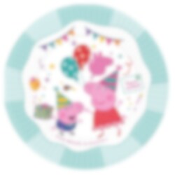 8 papieren borden met een kleurrijke afbeelding van Peppa Pig en haar broer George die verjaardag vieren. Perfect om de tafelschikking extra leuk te maken op het kinderfeestje. De borden hebben een diameter van 23 cm.