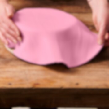 Bereidingswijze: haal de schijf uit de verpakking en rol deze voorzichtig uit. Trek aan beide randen van de witte folie om deze plat te maken. Bedek de cake met een dun laagje botercrème. Plaats de fondantschijf, met de witte folie naar boven, voorzichtig over de cake. Verwijder de folie en strijk de fondant voorzichtig glad op de taart. Snij het overtollige fondant eraf en versier de taart.