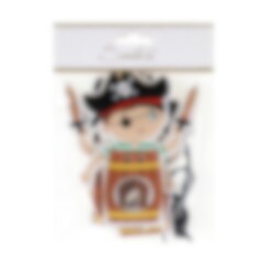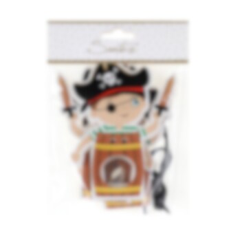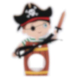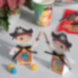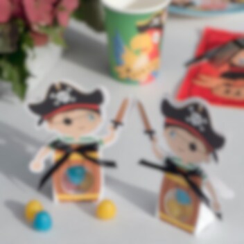6 kleine doosjes met een afbeelding van een stoer piraat zittend in een bruine ton. Vul deze met iets lekkers en zet ze op tafel als leuke verrassing voor je gasten op het piraten-kinderfeestje.
