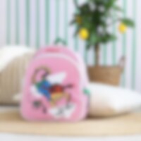 Voorzien van een handvat bovenaan en verstelbare schouderbanden zodat hij goed op maat kan worden afgesteld. Een kleurrijke en vrolijke rugzak met afbeeldingen uit de wereld van Pippi Langkous.