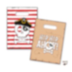 Maak het kinderfeestje nog leuker met deze leuke uitdeelzakjes in piratenthema, perfect om te vullen met snoep, kleine speeltjes en andere verrassingen voor de gasten. De zakjes hebben twee verschillende afbeeldingen: één met de tekst "Hip Hip Ahoy!" op een achtergrond die lijkt op een oude schatkaart en één met een doodshoofd, piratenhoed en rode strepen die het gevoel van een echt piratenavontuur versterken.