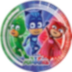 8 papieren bordjes met leuke motieven van Catboy, Owlette en Gekko van PJ Masks. De bordjes hebben een diameter van ongeveer 23 cm.