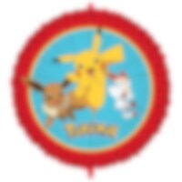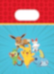 4 uitdeelzakjes van papier met kleurrijke Pokémon-afbeeldingen waarop Pikachu, Eevee, Scorbunny, Grookey en Sobble tevoorschijn springen tegen een blauwe achtergrond met rode Pokéball-rand. Perfect om te vullen met snoep, kleine speelgoed of verrassingen die de kinderen mee naar huis kunnen nemen na het kinderfeestje.