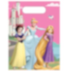 6 uitdeelzakjes van plastic met een prachtige afbeelding van Disney-prinsessen Sneeuwwitje, Assepoester en Rapunzel voor een sprookjesachtig kasteel. Perfect om te vullen met snoep en kleine verrassingen die de kinderen mee naar huis kunnen nemen na het kinderfeestje met Disney Prinsessen-thema.
