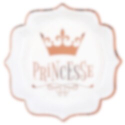 10 gevormde papieren bordjes in witte kleur met roségouden folieranden en met motieven van fijne prinsesdetails en de tekst "Princess" in roségoudfolie. Perfect om op tafel te zetten voor het prinsessen feestje.