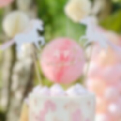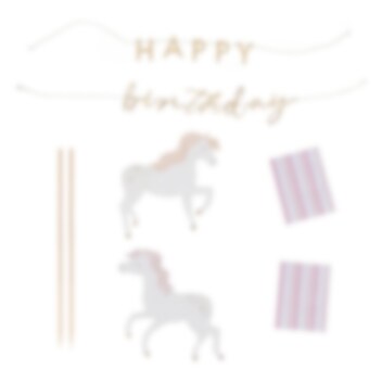 Cake Topper met afbeelding van twee paarden met kwaststaarten en houten pluggen die een mooie decoratie op de taart zullen zijn voor het kinderfeestje. Het pakket bevat ook een kleine slinger met de tekst "Happy Birthday" in goudfolie.