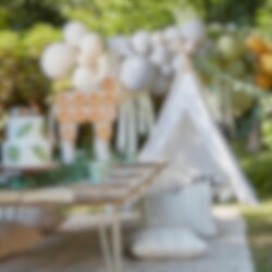5 stoer ballonnen gevuld met palmbladeren in dun papier. Een stijlvolle decoratie voor je jungle kinderfeestje. De ballonnen hebben een diameter van ongeveer 30 cm als ze zijn opgeblazen.