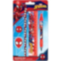 Coole schoolset met coole Spiderman motieven. Het pakket bevat een potlood, een inktpen, een liniaal, een puntenslijper en een gum.