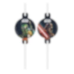 4 papieren rietjes met mooie afbeeldingen van Star Wars. De rietjes zijn ca. 21 cm lang en de afbeeldingen hebben een diameter van ca. 6,5 cm.