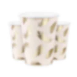 6 papieren bekers met motieven van met goud verijdelde veren van een zwaan. Zeer leuke accessoires om op te nemen in de setting voor de doop of babyshower. De bekers zijn ongeveer 9 cm hoog en hebben een inhoud van ongeveer 220 ml.