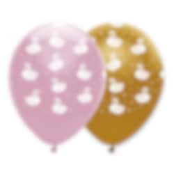 6 latex ballonnen in de kleuren roze en goud en met motieven van schattige zwanen. Leuk om mee te decoreren voor het kinderfeestje met Stylish Swan als thema. De ballonnen hebben een opgeblazen diameter van ongeveer 30 cm en kunnen zowel met gewone lucht als met helium worden opgeblazen.
