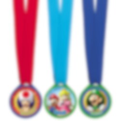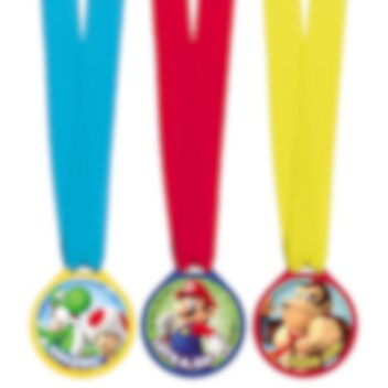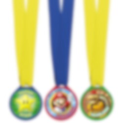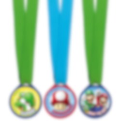 12 medailles in verschillende kleuren met afbeeldingen van de schattige karakters uit Super Mario Bros. Geschikt als prijs voor de verjaardags spelletjes of als cadeautje in de uitdeelzakjes van de kinderen. De medailles hebben een diameter van ongeveer 4 cm.