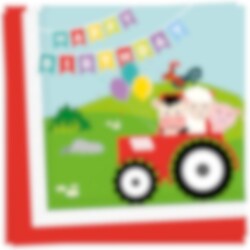 20 servetten met motieven van schattige boerderijdieren en een kleurrijke slinger met de tekst "Happy Birthday". De servetten hebben 2 lagen en zijn uitgevouwen 33 x 33 cm.