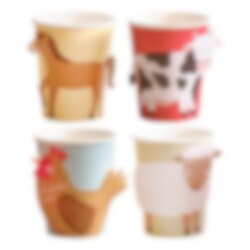 8 kleurrijke papieren bekertjes met pop-out motieven van schattige boerderijdieren. De bekertjes zijn 10 cm hoog en hebben een inhoud van 270 ml.
