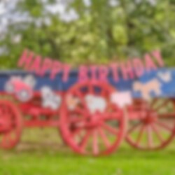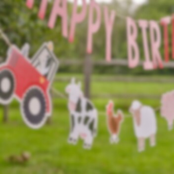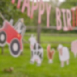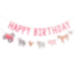 Leuke slinger met de tekst "Happy Birthday" en met motieven van diverse boerderijdieren. De slinger is gemaakt van karton en is 4 meter lang.