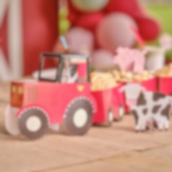 Grappige snackkraam die een tractor met 5 wagens voorstelt. De standaard werkt ook als tafeldecoratie.