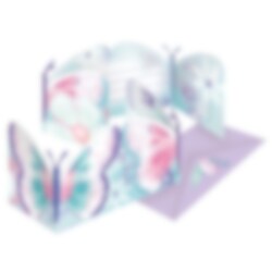 8 gevormde uitnodigingskaartjes in mooie kleuren met afbeeldingen van fantasievlinders en de tekst 'Party' in turkoois. Gebruik deze om je liefste vrienden uit te nodigen voor een leuk kinderfeestje met vlinderthema. De kaartjes zijn ongeveer 7,5 x 13,5 cm gevouwen en de verpakking bevat ook 8 lavendelkleurige enveloppen. Merk op dat de uitnodigingskaartjes geen tekst hebben.